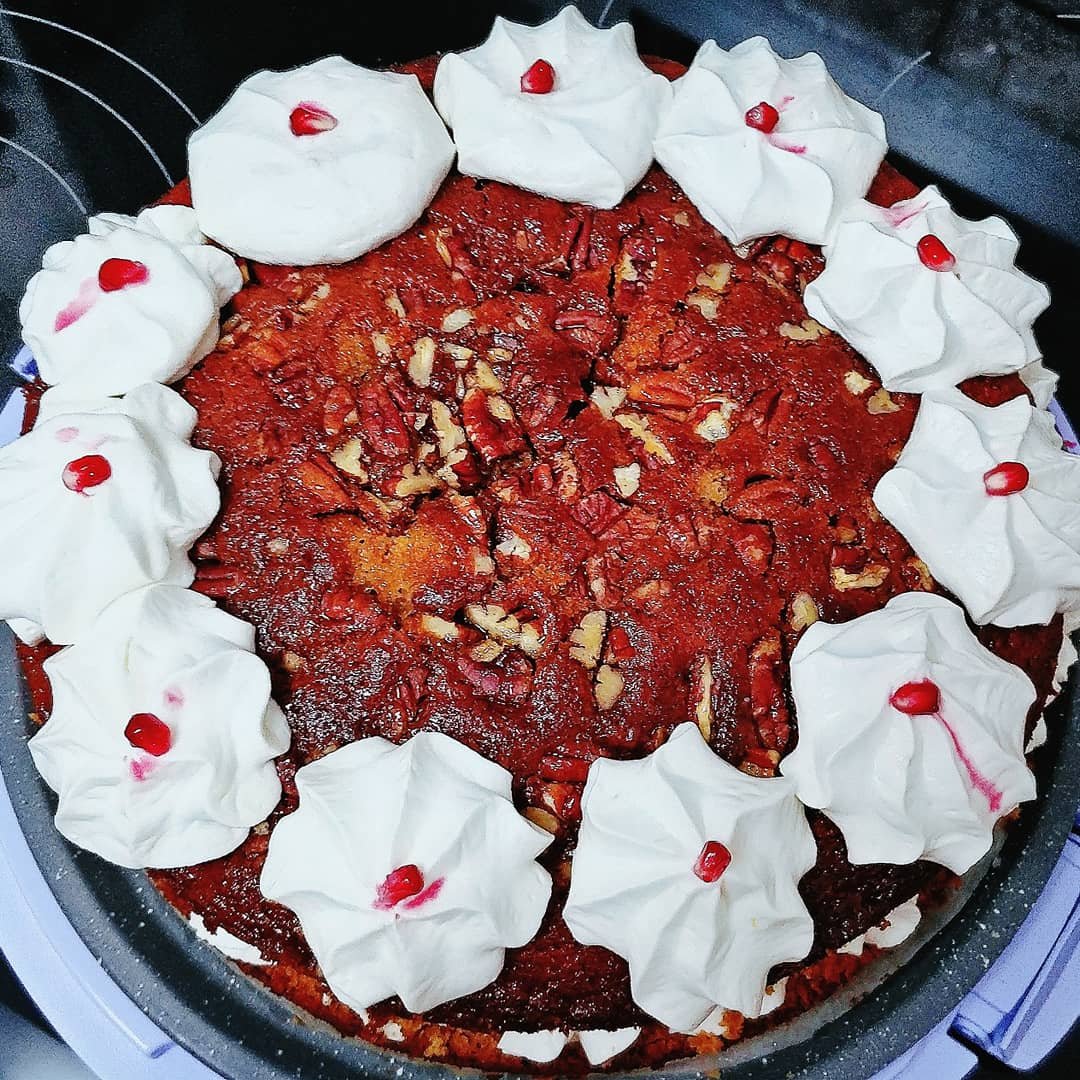 העוגה שלי היא עוגת דבש 🍯 עם טימין ואגוזי פקאן, באמצע קרם מסקרפונה ומייפל ולמעלה קצפת שוקולד לבן עם קישוט של גרגר רימון 😊.